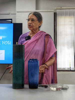 I demonstrated 2 arrangements, ‘Ike’as pond ‘bana’ as plant materials and showed the signnificance of kenzan positions and dedicated the same to my Ikebana teacher, Mrs. Uma Rao of Delhi. The next 2arrangements in Nageire, focused on shape and texture and dedicated to Sri. Rabindranath Tagore who visited Japan in 1916 , subsequently met Thesophists at Adyar and brought ikebana and haiku to Shantiniketan. Both these are representative of aesthetic practice. Lastly did an arrangement showing ‘The Whole’ by using 5 different materials at different heights and angles. I could not remove any from their positions as the concept of The Whole’ is disturbed. Dedicated this to The School of the Wisdom and to Mr. Rohit Mehta who conducted the sessions in Theosophical Society.I am immensely grateful to These remarkable persons who have contributed to my aesthetic experience.