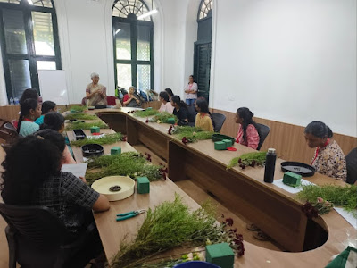 WCC , a reputed womens college in Chennai of long standing and hooding it’s reputation till today, have started a new department of studies, namely, International studies. They invited Chennai Sogetsu Study Group to hold a demonstration and Workshop for their students. Our Director agreed. It was held from 12th-14th August. It was a wonderful experience to hold it in a traditional, well maintained premises, with the enthusiasm of young budding ladies. Many other departments like Psychology and botany and sociology too showed interest in this activity as our Director emphasised its signicance on ‘application’ and ‘ practice’ as a technique useful in other activities in all spheres of Life.